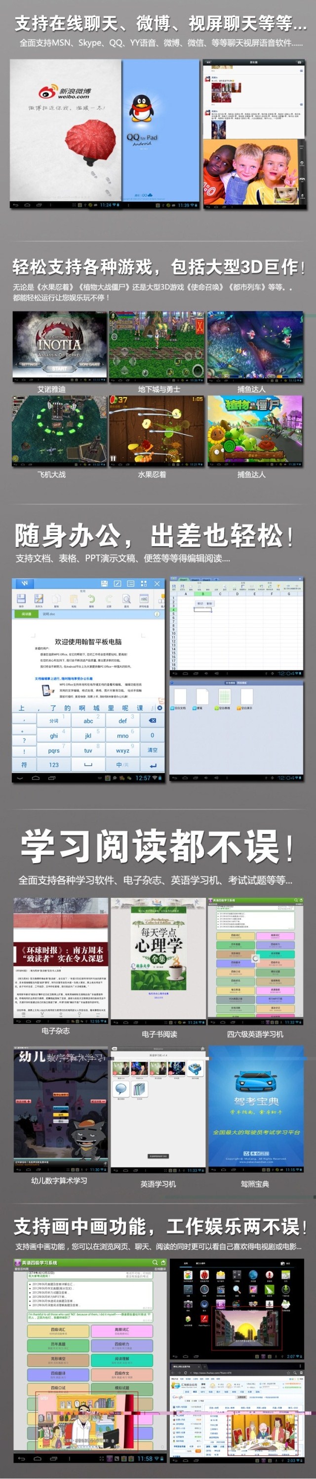 產(chǎn)品主要功能:音樂播放、視頻播放、圖片瀏覽、電子書、設(shè)置、錄音、文件管理器、游戲、電子詞典、 0TG功能、支持上網(wǎng)、聊QQ、玩游戲、看微愽、下載安裝程序、超溥純平、10點電容/觸摸屏、辦公軟件:Quickkffice /Word//Excel/PPT/PDF等。。。