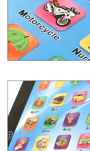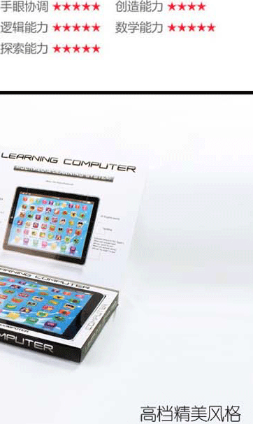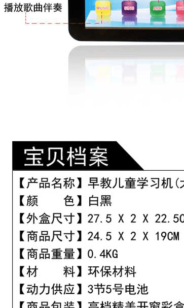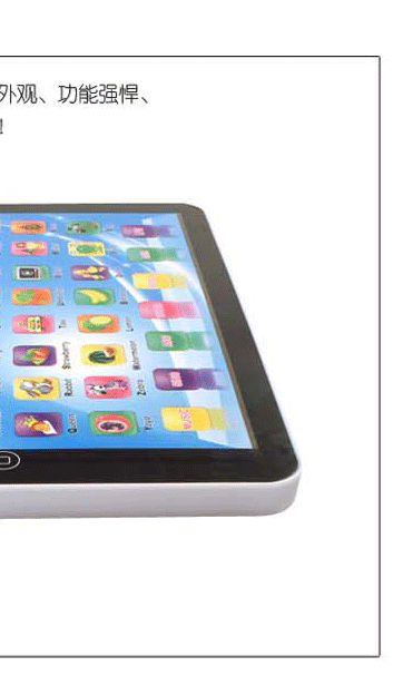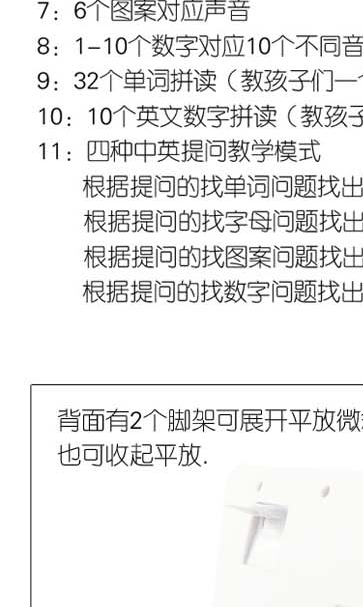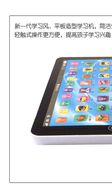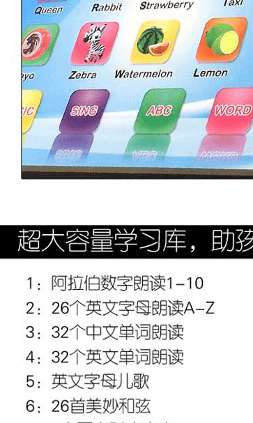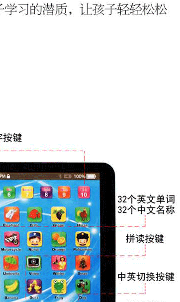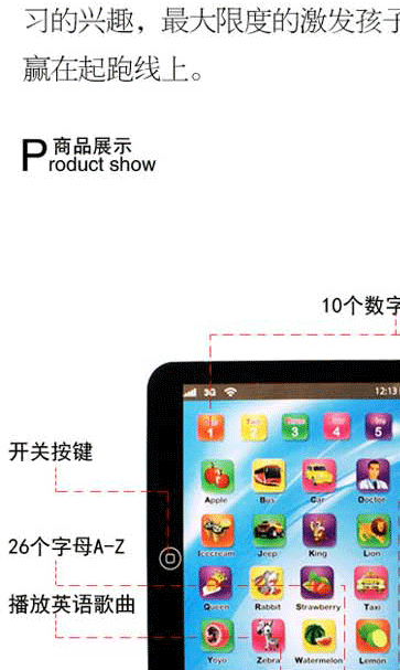 新一代學(xué)習(xí)風(fēng),時尚的早教玩具哦,屏幕是塑料膜,不是顯示屏幕哈,真正不傷小朋友眼睛的好玩具,應(yīng)該人手一臺,趕緊行動哦,孩子一定會喜歡的。 學(xué)習(xí)A-Z發(fā)音,中英文轉(zhuǎn)換發(fā)音,拼讀單詞 增強小朋友記憶 播放音樂 有琴鍵音符功能 提問做游戲 早教是近年來作為父母持續(xù)提升的一個概念,早教機的熱銷也就應(yīng)運而生了,從良興,到迷你早教機,到掛圖,孩子的要求也在不斷提升,有iphone ipad的父母應(yīng)該最清楚孩子對這些的“好”到什么程度,可以不吃,可以抱著睡覺,可以不肯還給您,那么這樣造型的玩具有木有呢,原來沒有,現(xiàn)在有了,這就是其中一款,非常棒的早教機,這是您家寶寶的,不是您的哦~~ 中英文觸摸屏板 功能強大內(nèi)容多能讓小寶寶更容易學(xué)習(xí) 有中文/英文2種功能,可以聽音樂,教小朋友識圖說話,找數(shù)字,找單詞,找字母,按錯的話,還會語音矯正,是小朋友真正的益智的玩具。